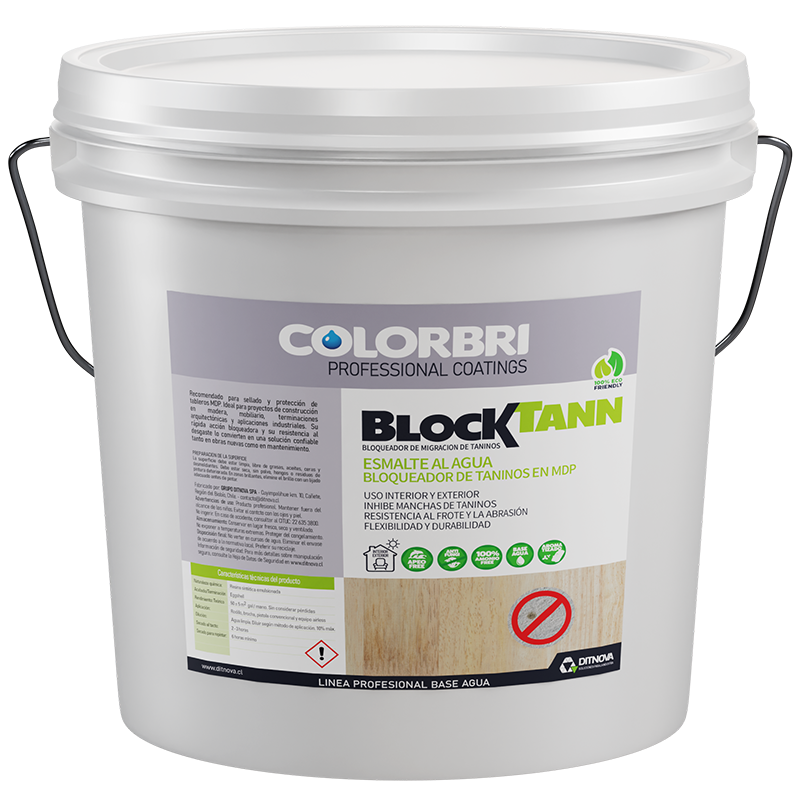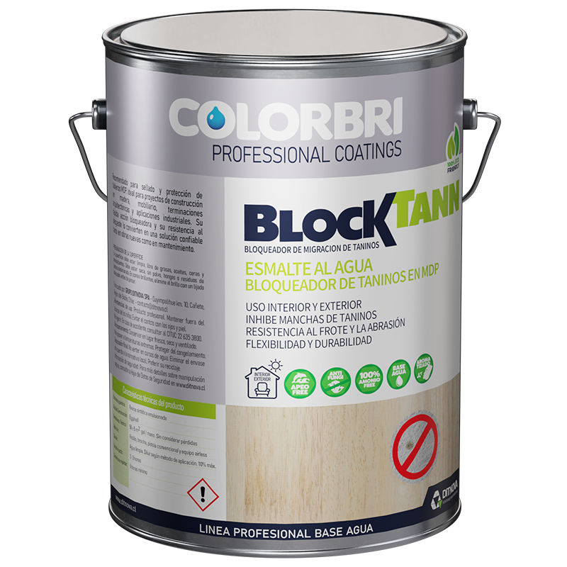 BLOCKTANN COLORBRI es un esmalte acrílico base agua formulado con resinas sintéticas emulsionadas y aditivos inhibidores de taninos, especialmente diseñado para prevenir el manchado característico en tableros de MDP.