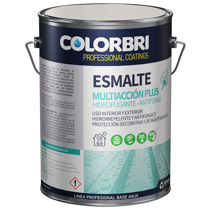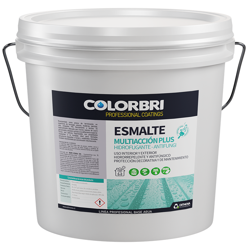 Esmalte Multiacción Plus COLORBRI es una pintura acrílica base agua de terminación semibrillo, formulada con emulsiones y aditivos especializados que generan una película protectora hidrorrepelente, antifúngica y altamente duradera.