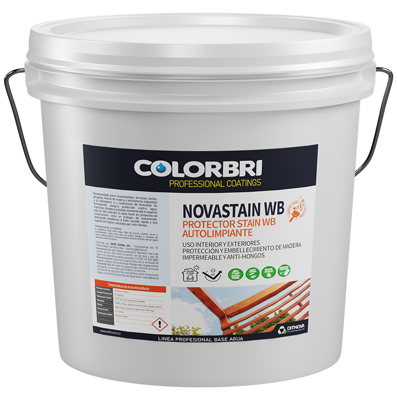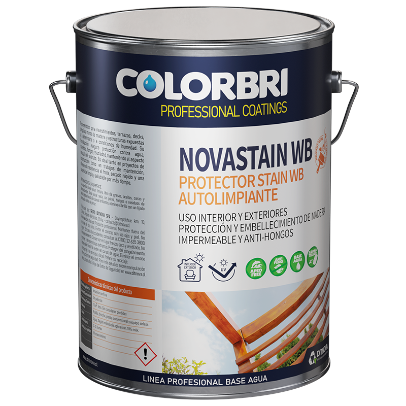 NOVASTAIN WB – Protector Stain WB Autolimpiante COLORBRI es un protector y embellecedor de la madera base agua, formulado con emulsiones acrílicas y aditivos hidrofugantes de última generación. Su tecnología autolimpiante y biocida otorga una película invisible que protege contra la humedad, hongos y microorganismos, manteniendo a la vez el aspecto natural de la madera.